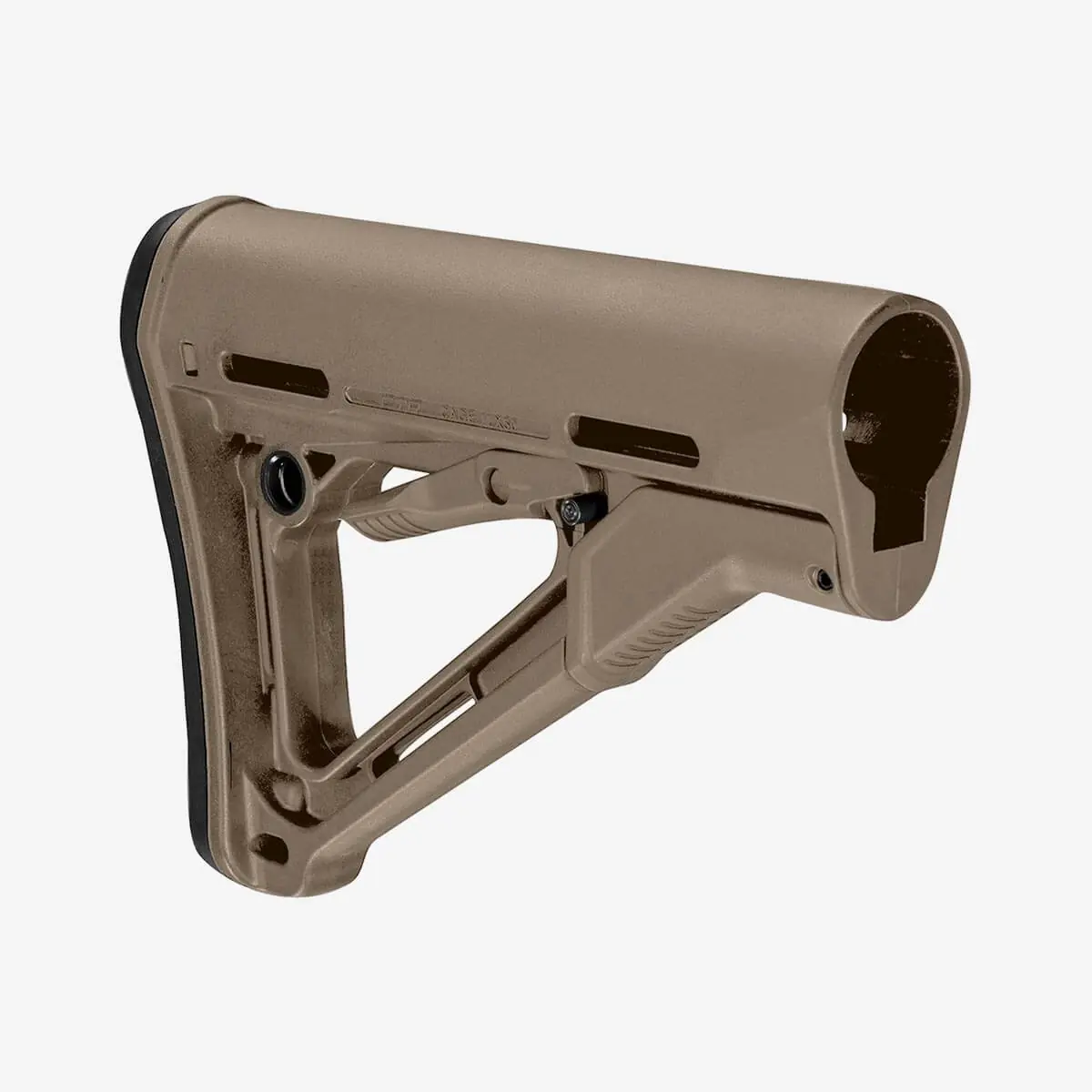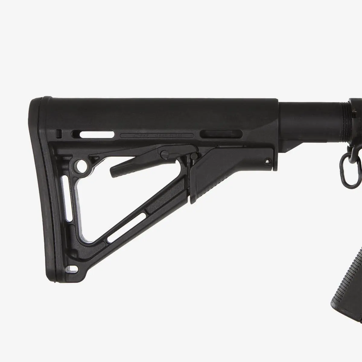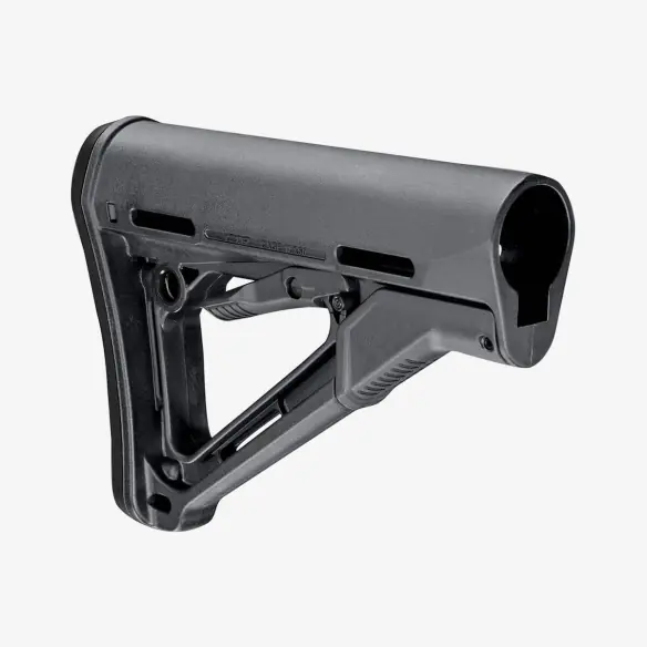 The CTR Carbine Stock has set the standard for years with easy adjustment, smooth handling, clean looks, and practical sling mounting. Its streamlined A-frame design helps prevent snagging and protects the ambidextrous release latch from accidental use.
